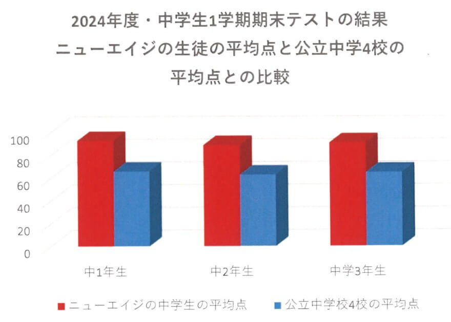 New Age の 中学生の2024年度 1学期中間・期末の結果がでました! 2024.07.16 お知らせ 2024年度・中学生の1学期中間、1学期期末のテストの結果です! ニュー・エイジ・イングリッシュ・スクールの中学生(それぞれの学年)の平均点と地元公立4校の平均点の比較! ビックリです! 下にあるグラフをご覧ください! 中学生の皆様、おめでとうございます! 2学期も頑張りましょう! メアリー先生より Share us! 前へ 次へ お知らせ一覧に戻る